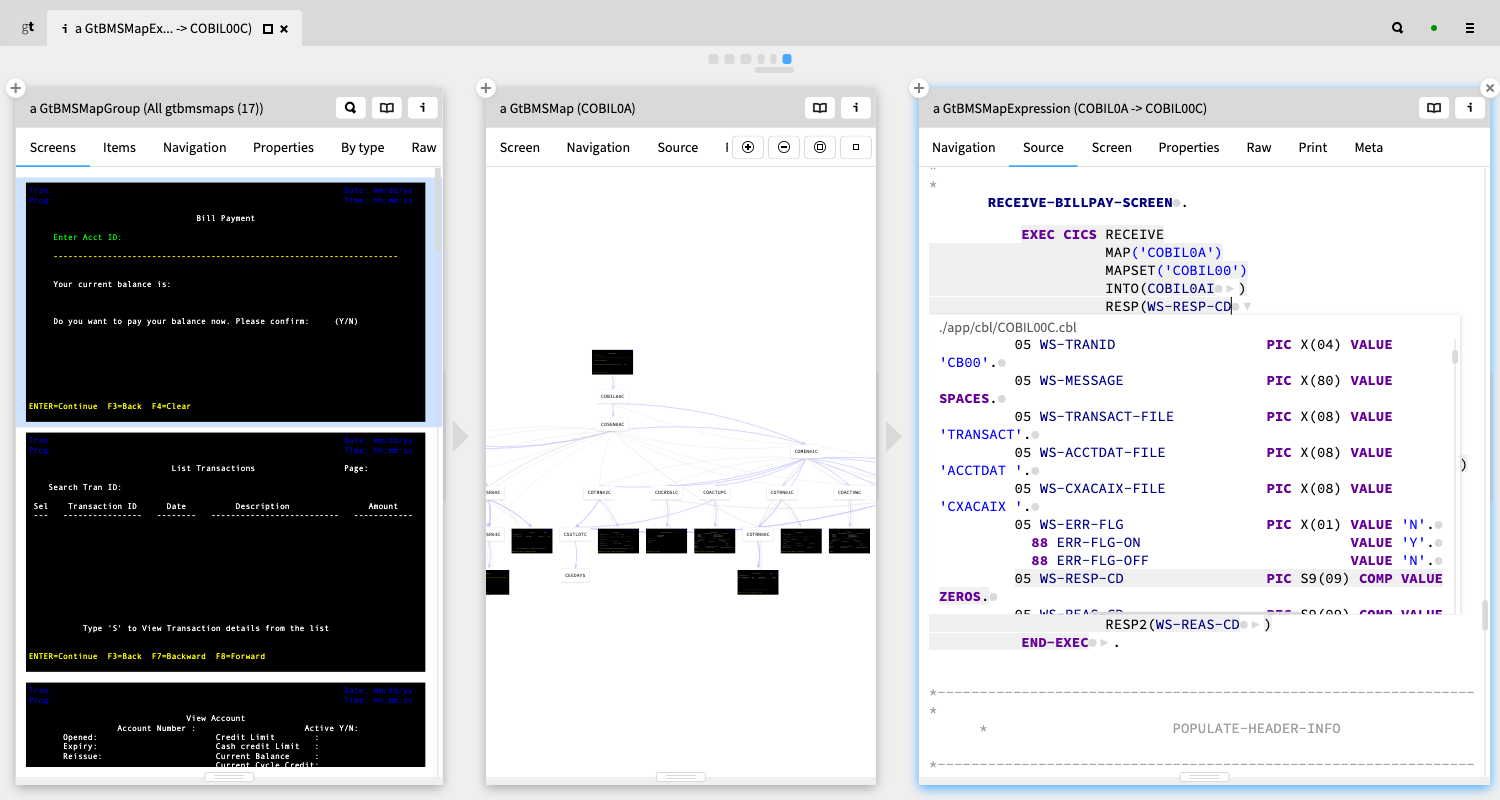 Exploring COBOL screens, control flows and source code.