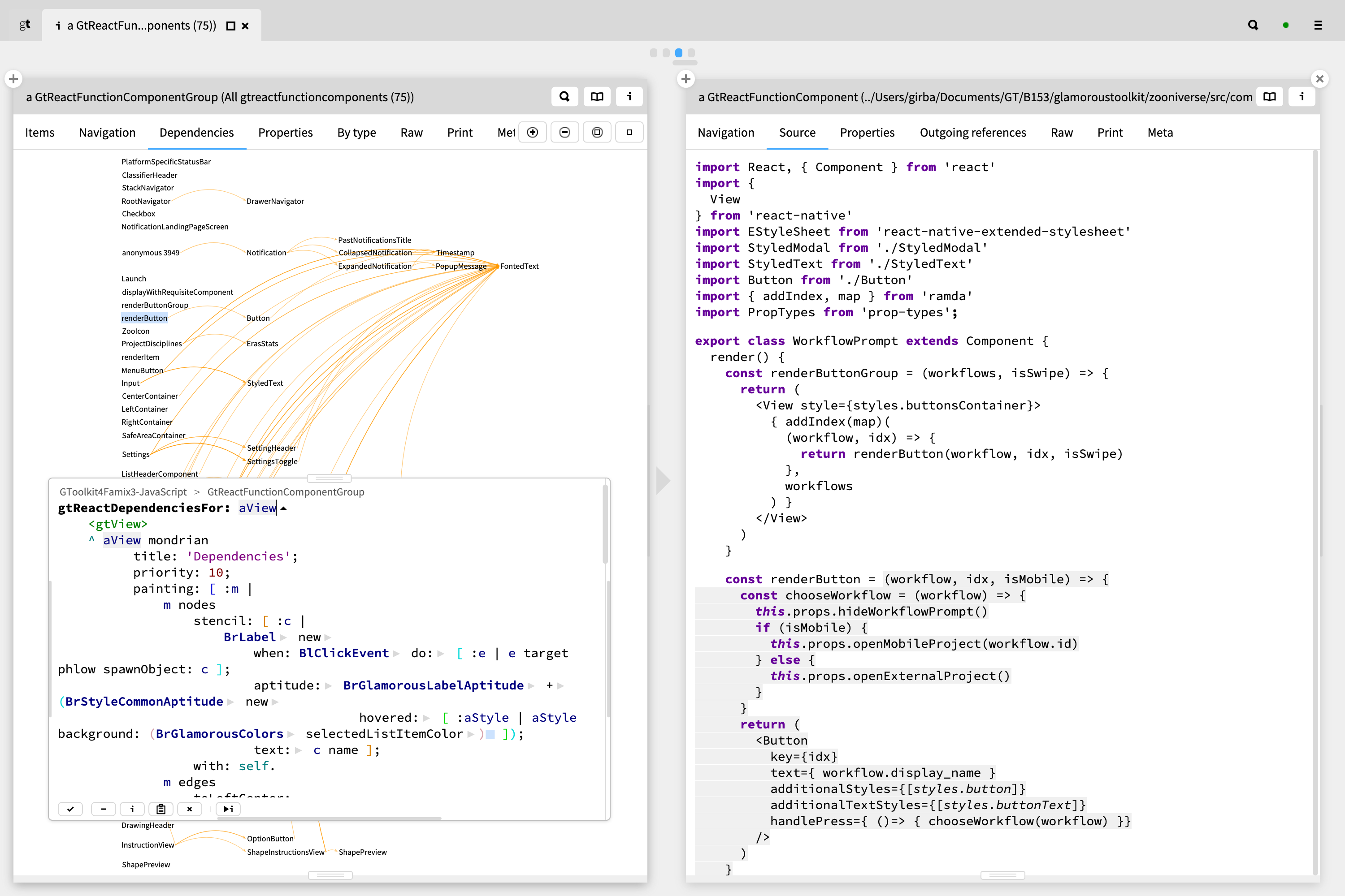 Adjusting a view showing the dependencies of React components in a live editor.